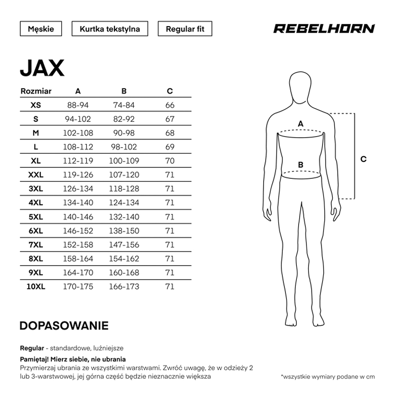 Aby dobrać odpowiedni rozmiar kurtki Rebelhorn JAX, zmierz obwód klatki piersiowej w najszerszym miejscu, prowadząc miarę poziomo. Pomiar wykonuj na lekkiej odzieży, stojąc prosto. Otrzymany wynik porównaj z tabelą rozmiarów producenta. Jeśli znajdujesz się na granicy rozmiarów, wybierz większy, aby zachować komfort i swobodę ruchów.