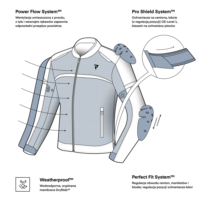 Rebelhorn Echo świetnie sprawdza się w zmiennych warunkach pogodowych. Duże panele steel mesh zapewniają intensywną wentylację podczas upałów, a wypinana membrana DryRide™ chroni przed deszczem i wiatrem, gdy pogoda się pogarsza. To dwuwarstwowa kurtka motocyklowa street, którą łatwo dopasujesz do aktualnych warunków.