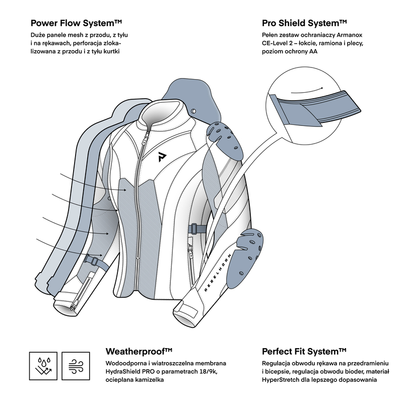 Rebelhorn Hiflow V Lady to certyfikowana damska kurtka motocyklowa CE Level AA, wyposażona w komplet ochraniaczy Armanox. Zapewnia realną ochronę w razie upadku, bez kompromisów w kwestii wygody.