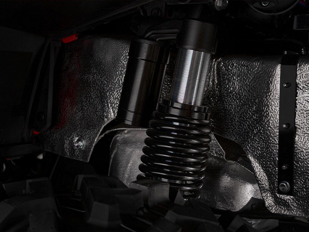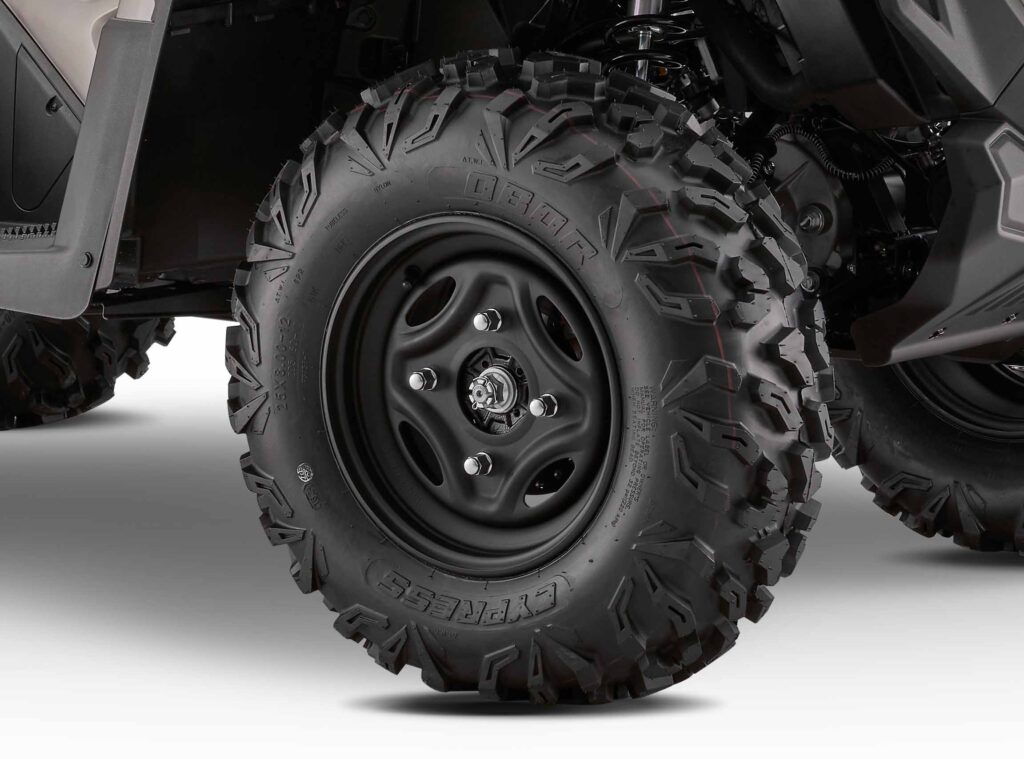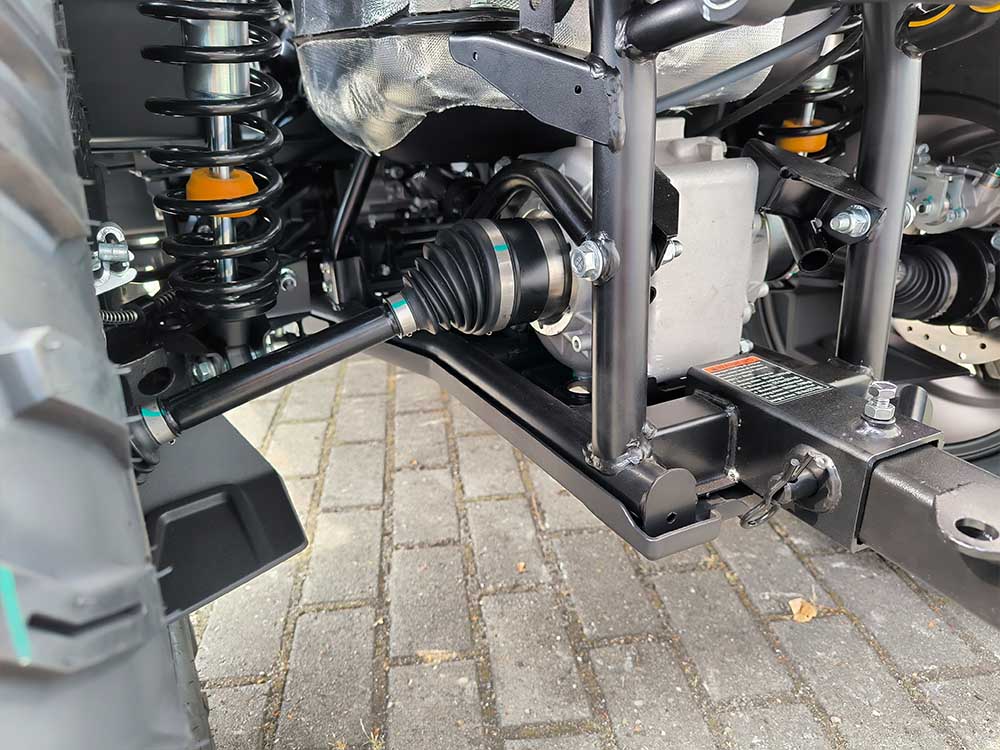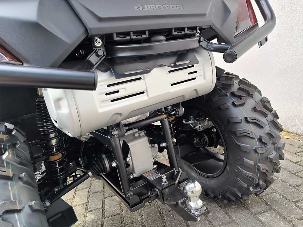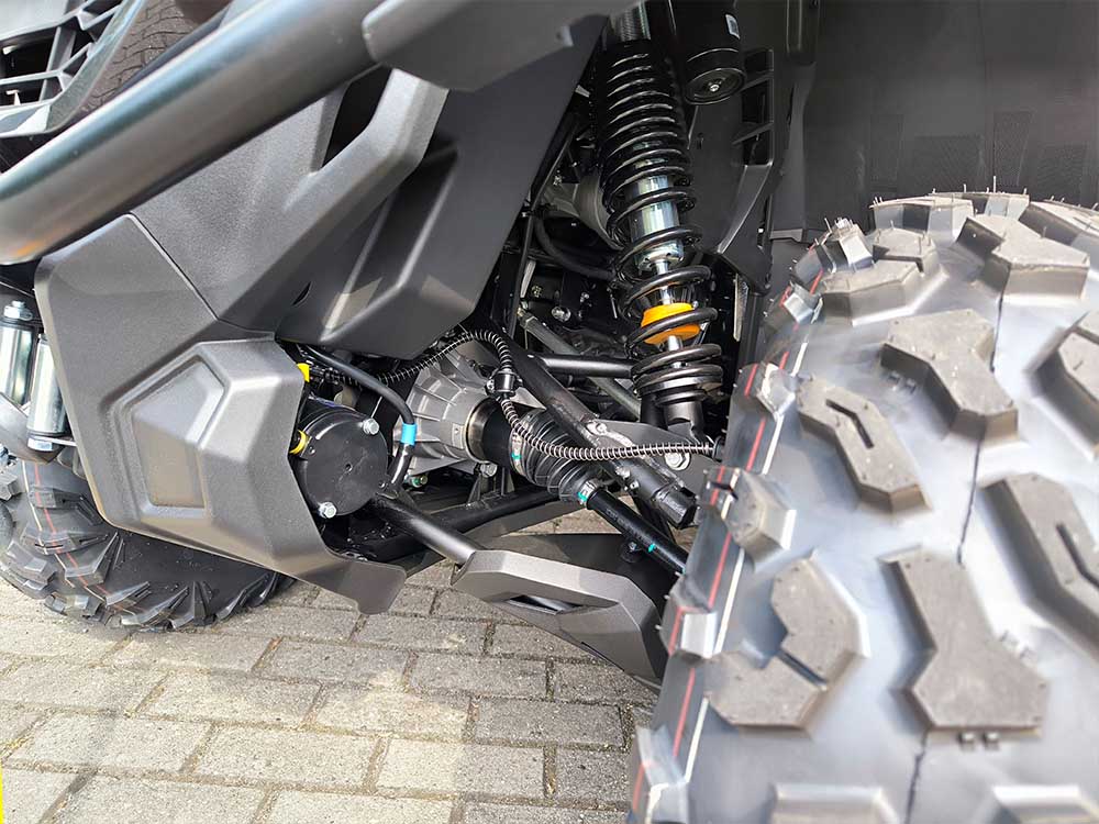Quad wyposażono w przekładnię CVT renomowanego producenta CV TECH, stosowaną przez największe światowe marki ATV. Układ napędu na wszystkie koła oferuje cztery tryby pracy, które pozwalają dostosować zachowanie pojazdu do warunków terenowych. Tryb 2WD z blokadą dyferencjału idealnie sprawdza się na twardych nawierzchniach, natomiast 2WD z odblokowanym dyferencjałem umożliwia bezpieczną jazdę z większą prędkością i skręcanie bez niszczenia podłoża. W trudniejszym terenie kierowca może przełączyć się na 4WD, a w najbardziej wymagających warunkach skorzystać z pełnej blokady mechanizmu różnicowego, która zapewnia maksymalną trakcję.
