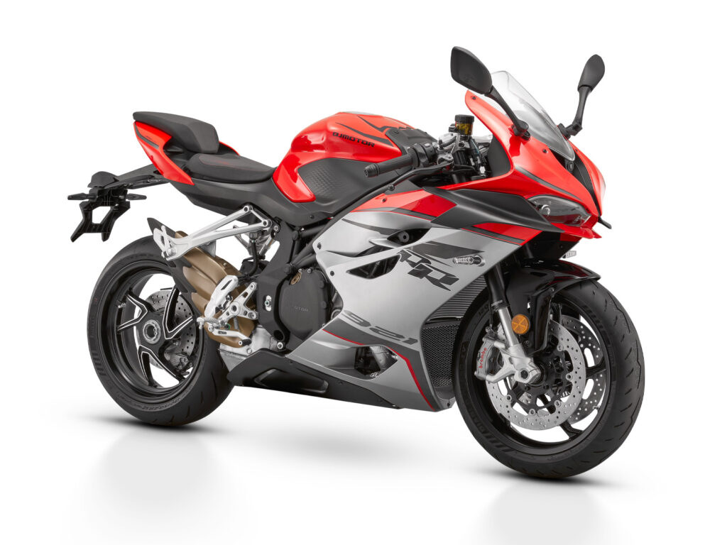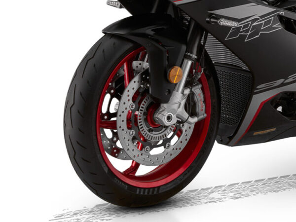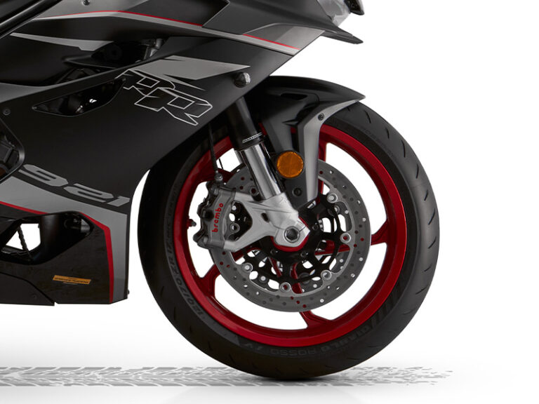 Za brutalną skuteczność hamowania odpowiada topowy zestaw hamulców Brembo Stylema z przodu, z radialnymi, czterotłoczkowymi zaciskami oraz radialną pompą hamulcową. Z tyłu pracuje dwutłoczkowy zacisk Brembo. Układ ten oferuje liniową, łatwo dozowalną siłę hamowania oraz perfekcyjne wyczucie klamki nawet przy bardzo agresywnej jeździe. Bezpieczeństwo i kontrolę wspiera zaawansowana elektronika z sześciosiowym czujnikiem IMU. Systemy Cornering ABS oraz kontrola trakcji TCS działają również w złożeniu, analizując pochylenie, przyspieszenia i opóźnienia motocykla w czasie rzeczywistym. Dzięki temu SRK 921 RR zachowuje pełną stabilność nawet w najbardziej dynamicznych sytuacjach.